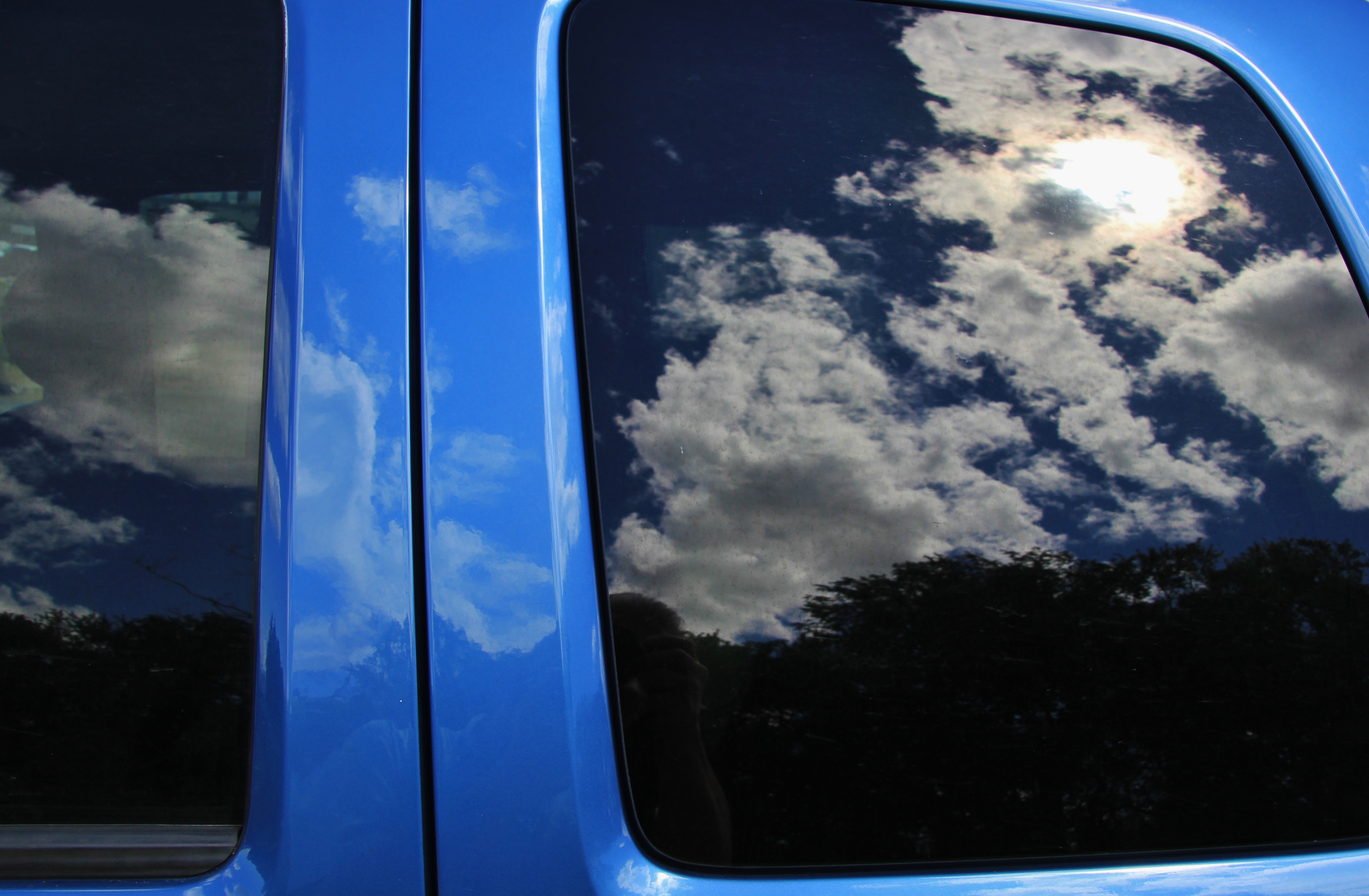 Have you ever noticed how vividly light reflects off of tinted glass, and even clear-coat painted metallic surfaces? Like watching a movie, I gazed at the clouds which strolled by the side windows of my Jeep. They skirted by without even a whisper…only a moving reminder that they existed…for only a short while before fading out of sight. In between the clouds the sun shone in all her brilliance. It was she who illuminated the clouds in the first place. And, it was she who made the reflection possible. No light, no radiance, no reflection.